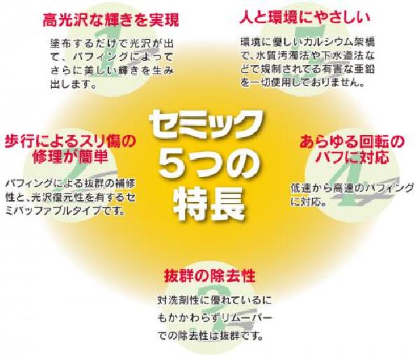 バフィングで光沢を復元できるセミバファブルタイプのワックスです。剥離が難しい場所での使用に最適です。