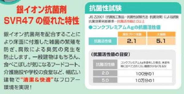 ・銀イオン抗菌剤配合で、床面の雑菌の繁殖を防ぎ、悪臭の発生を低減。清潔で快適なフロア環境を実現。