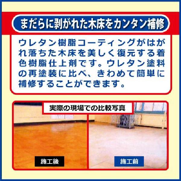 ウレタン仕樹脂塗装が剥がれた木床の復元にしようする着色樹脂仕上げ剤です。