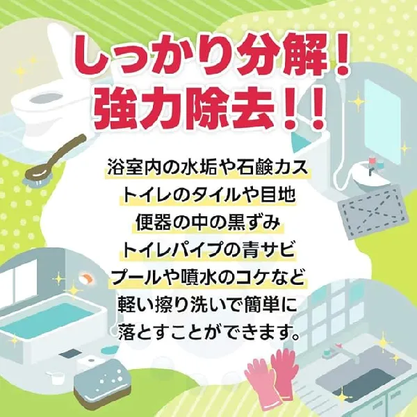 塗って軽く洗浄するだけで、ウロコ・水あか・石鹸カス・青サビ・赤カビ・コケを除去する粘性タイプの酸性洗剤