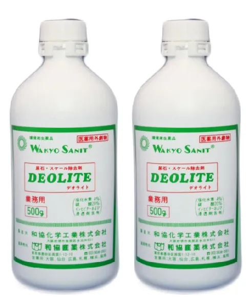 「デオライト 500ml」は、小便器の目皿や配水管にこびりついて、悪臭や詰まりの原因となる尿石を酸の力で素早く溶かして取り除くトイレ用洗剤です。便器に流し込むだけで、トイレがさわやかに。
