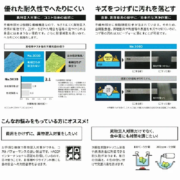 食の安全に着目し、設計された食器、調理器具等の洗浄用の貼り合わせスポンジたわしです。