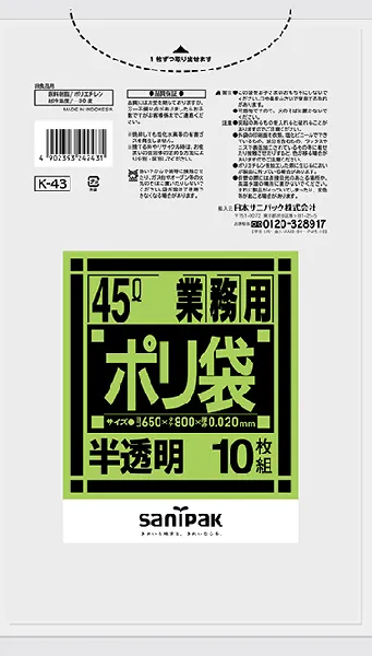 日本サニパック 業務用ゴミ袋 45L K-43 半透明 10枚×60冊