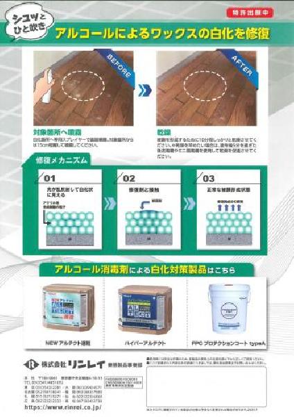 ショッピングモール、病院、飲食店、公共施設、ホテルなどで、消毒用エタノールで白くなった(白化)フロアワックスを、スプレーするだけで誰でも簡単に補修できます。