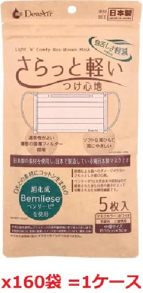 小津産業 DEWAirさらっと軽いつけ心地マスク 中間サイズ 5枚入x160袋