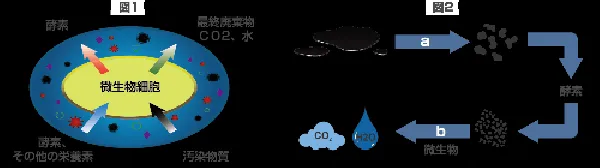 洗浄液中の微生物が、油汚れなどの有機汚染物質を洗浄液中の栄養素と共に自身の細胞内に取り込みます(図1)。