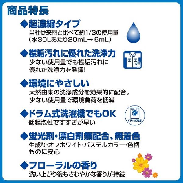 蛍光剤・漂白剤無配合。洗い上がり後はフローラルのさわやかな香りが持続します。超濃縮タイプ。