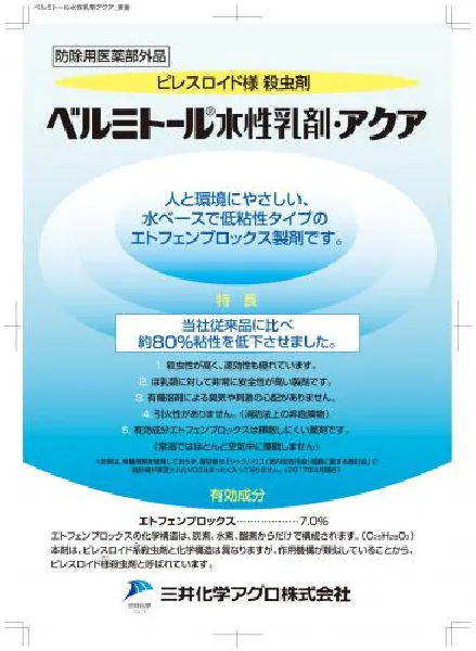ベルミトール水性乳剤・アクアは幅広い衛生害虫に有効な、人と環境に優しい、水ベースで低粘性タイプのエトフェンプロックス製剤です。