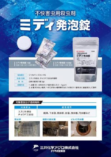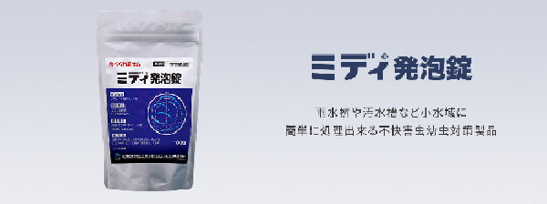 ミディ発泡錠は泡の力で有効成分が速やかに拡散する、雨水桝や汚水槽など小水域の不快害虫幼虫対策に適した製品です。