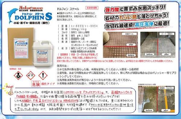ドルフィンスケールは、水垢の主な原因シリカスケールを『ファイヒアンモン』で、炭酸カルシウムを『硝酸有機酸』で溶かす非常に強力な両性質を合わせ持った珍しいタイプです!しかも硝酸の『有毒なガスが出ない』特殊技術によって製造されています。更に石材やコンク リート表面の【もらい錆】も除去可能!! ただ強力過ぎて 『タイルや石村のモルタル目地自体も荒らしてしまいます』ので、 あまり時間をおかずに洗浄〜すすぎをするようにしてください!