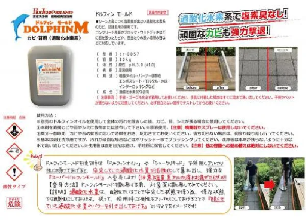 ドルフィンモールドを使う時は「ドルフィンオイル」や「シャークリキッド」を併用しアルカリ性に傾けてあげると、安定していた過酸化水素が活性化して暴れ出し、強力な 「スーパードルフィンモールド』へ変身します!(注意)麦系アルカリ剤は混ぜたらダメ!!