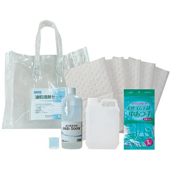 ●コンパクトサイズで携帯に便利なビニールバッグに、油処理剤一式を収納。