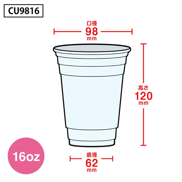 ● 口径98mm x 高さ120mm x 底径62mm、約16オンス、広口タイプのPETカップ(プラカップ)です。