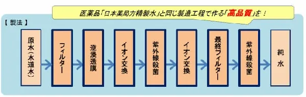 ・原水→フィルター→逆浸透膜→イオン交換→紫外線殺菌→イオン交換→最終フィルター→紫外線殺菌→高純度純水