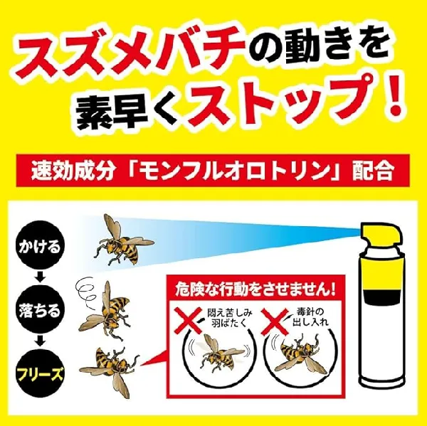 用途 スズメバチ、アシナガバチ、ミツバチ、クマバチ、アブ、ブユ、ユスリカ、ガ、ゲジゲジ、ムカデ、ヤスデ、カメムシ、クモ、ケムシ、羽アリの駆除