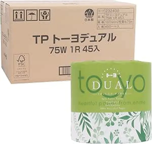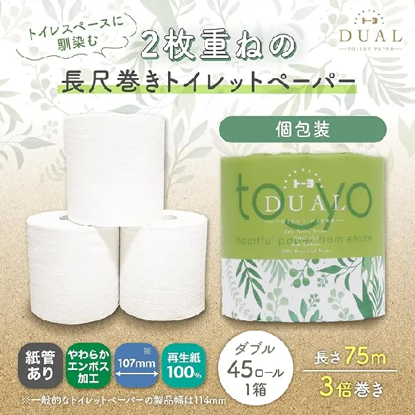 DUALシリーズのトイレットペーパーは、上質古紙(再生紙)を100%使用。やわらかエンボス加工でミシン目入り。